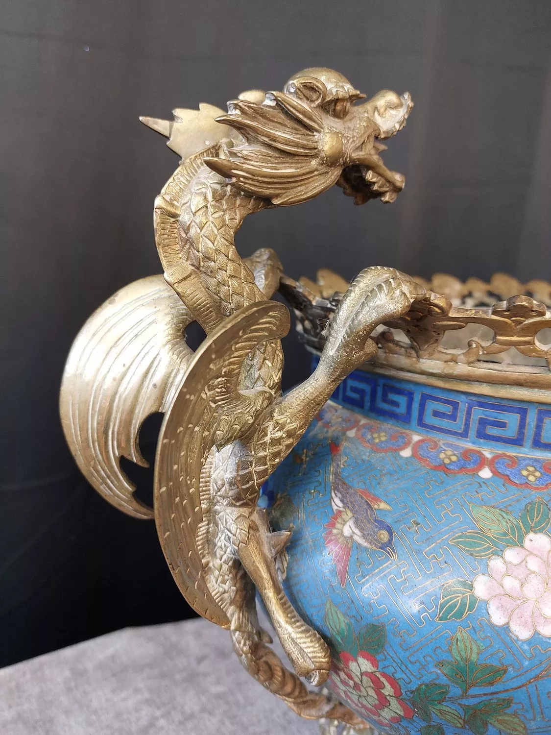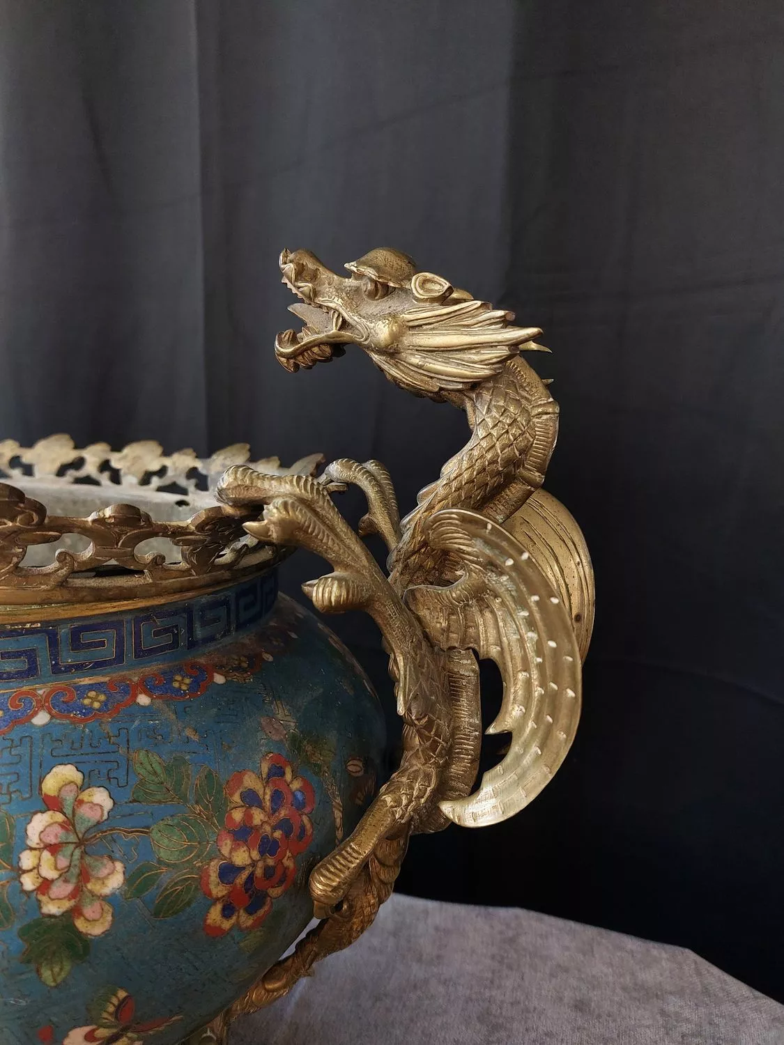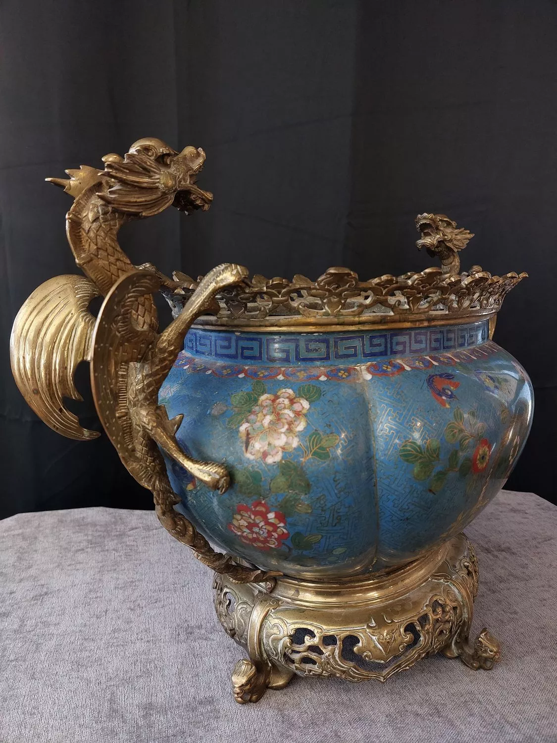 Prises en bronze doré en forme de dragons, galerie et socle en bronze doré.
