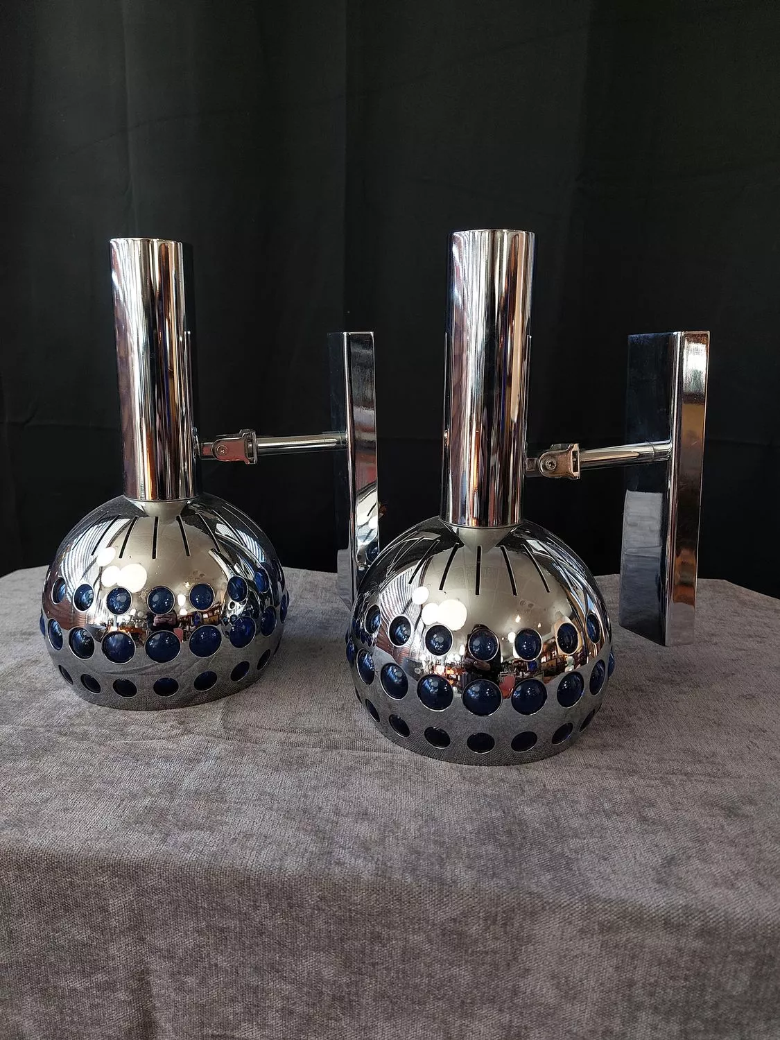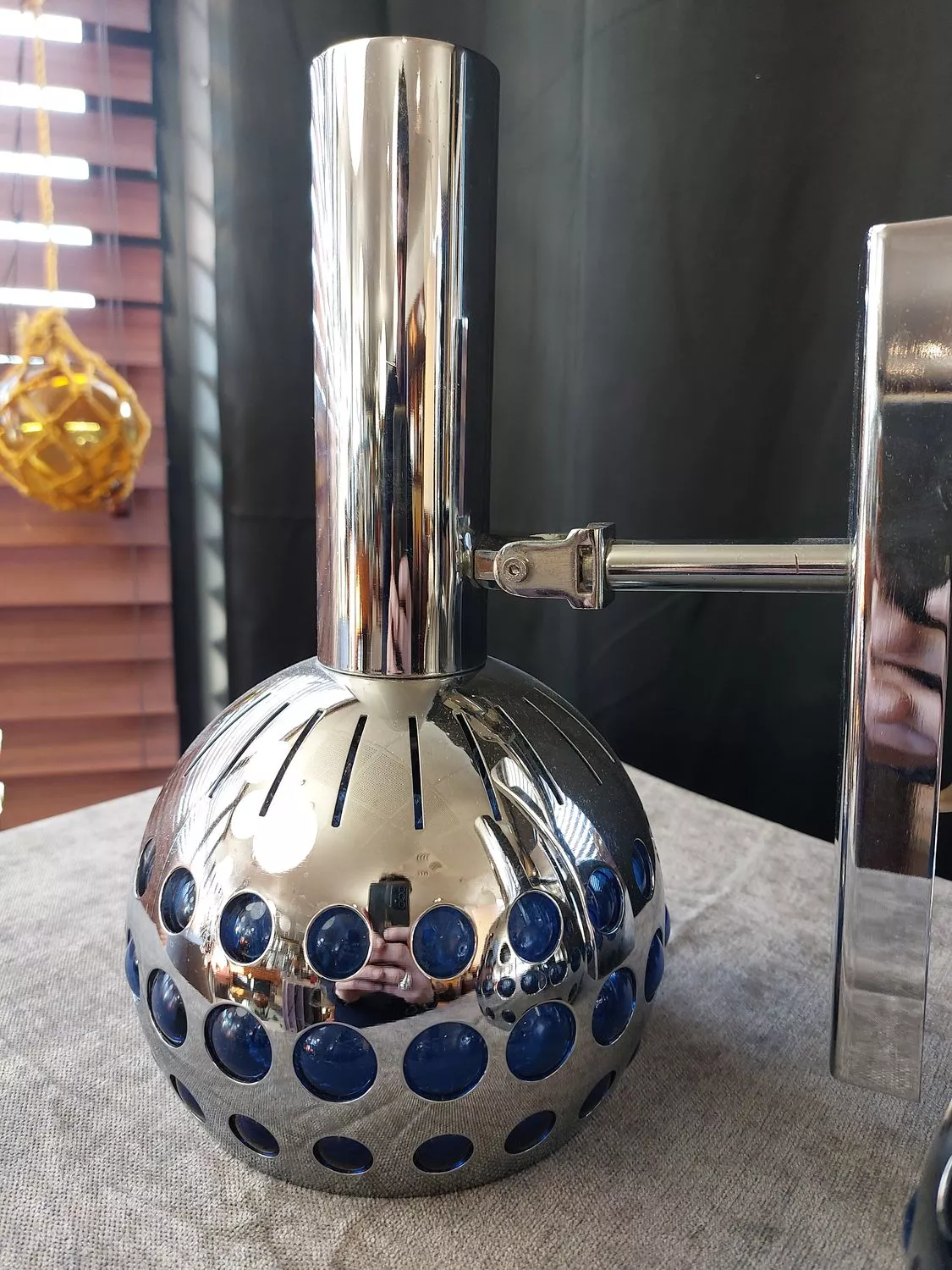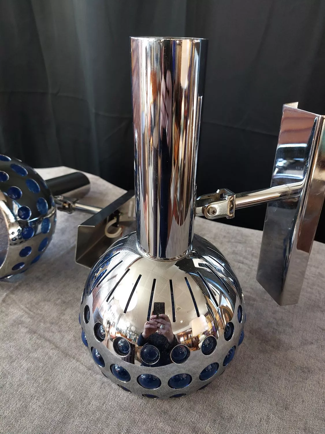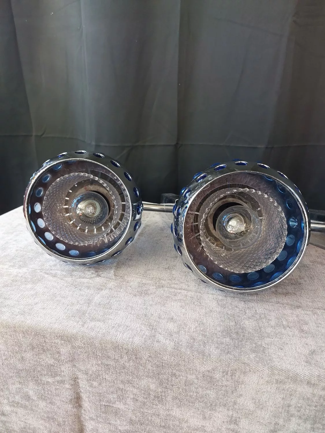 Métal chromé et filtre en cabochons plexiglas bleu.